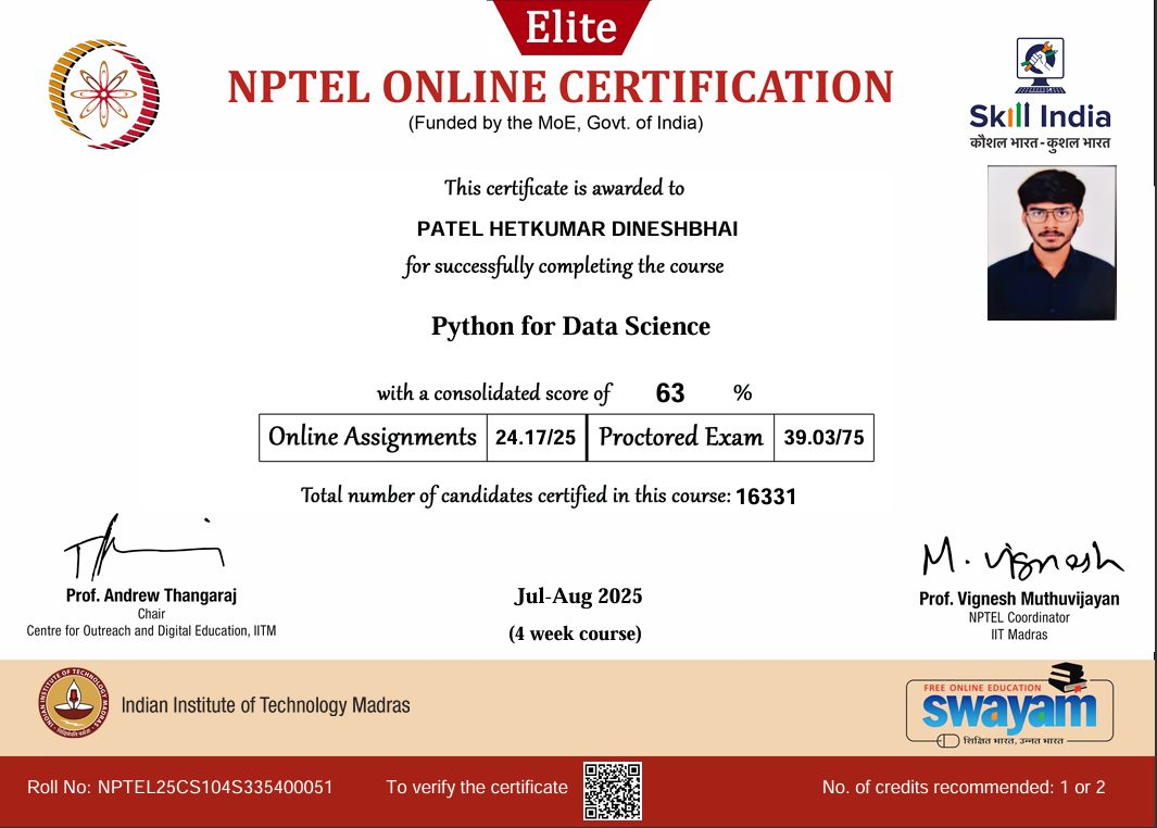 National Programme on Technology Enhanced Learning certification from IIT, demonstrating academic excellence in technology.